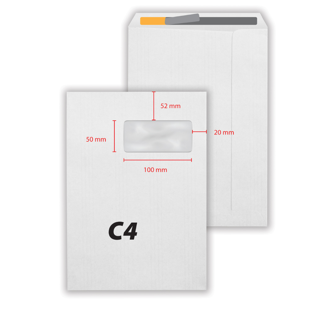 Plic C4, 229 x 324 mm, fereastra dreapta 50 x 100 mm, alb, banda silicon, 80 g/mp, 250 bucati/cutie